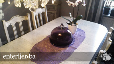 Kao redovna čitateljka Enterijer.ba kaže da joj je članak Ljubičasta je in jedan od omiljenih na sajtu, jer je ljubičasta njena omiljena boja. Tako je vođena sa više ideja odlično ukombinovala tradicionalni stolnjak, obojen u ljubičasto, sa modernom posudom i bijelom orhidejom. Prostor je dobio svježinu, a lijepe nijanse drveta su sada vidljivije i tonovi se odlično slažu.