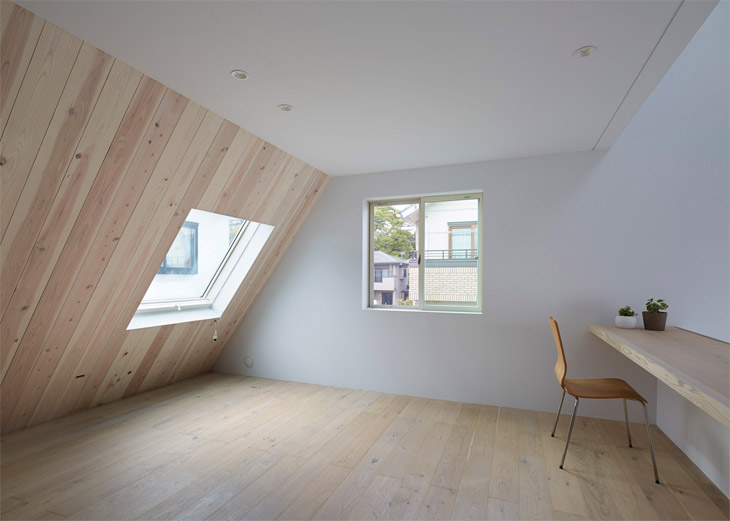 Impresivan krov bio je polazna tačka prilikom dizajniranja kuće, nakon kojeg je studio kreirao tri sprata predviđena za stambeni prostor. U prizemlju se nalaze dnevna soba sa trpezarijom, kuhinja i kupatilo.
