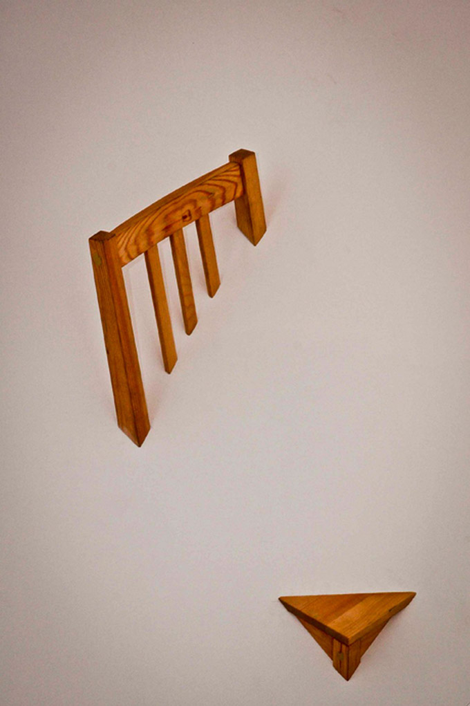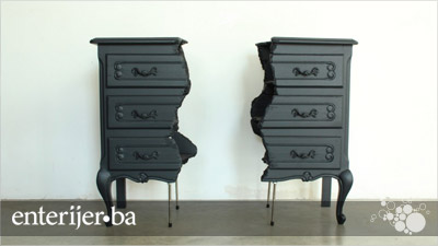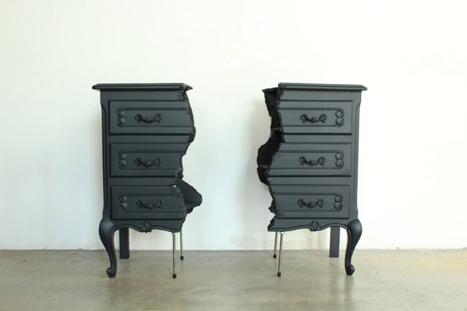 Ovdje je više riječ o skulpturalnom djelu. Mala komoda se koristi kao osnova. Inspiracija dolazi iz rabljenog namještaja. Podijeljena na dvije polovice, isprva je nefunkcionalna, ali dodavanjem šipke sa vijcima i navojima dobijene su dvije funkcionalne škrinje.