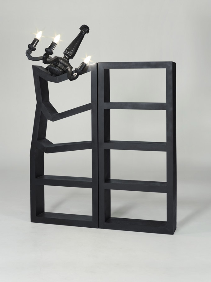 Ovaj unikatni komad namještaja u potpunosti odgovara filozofiji organizacije, pored svih drugih sjajnih radova napravljenih od rabljenog namještaja. Polica je izrađena od metala, a luster od čvrstog hrastovog drveta obojenog u crno, kako bi se unaprijedila njegova silueta uništenja. Oba predmeta gube na svojoj funkcionalnosti, ali udruženi dobijaju novi zadatak. Naknadno dodata vrijednost je prizor humora koji ovo djelo ističe u masi.