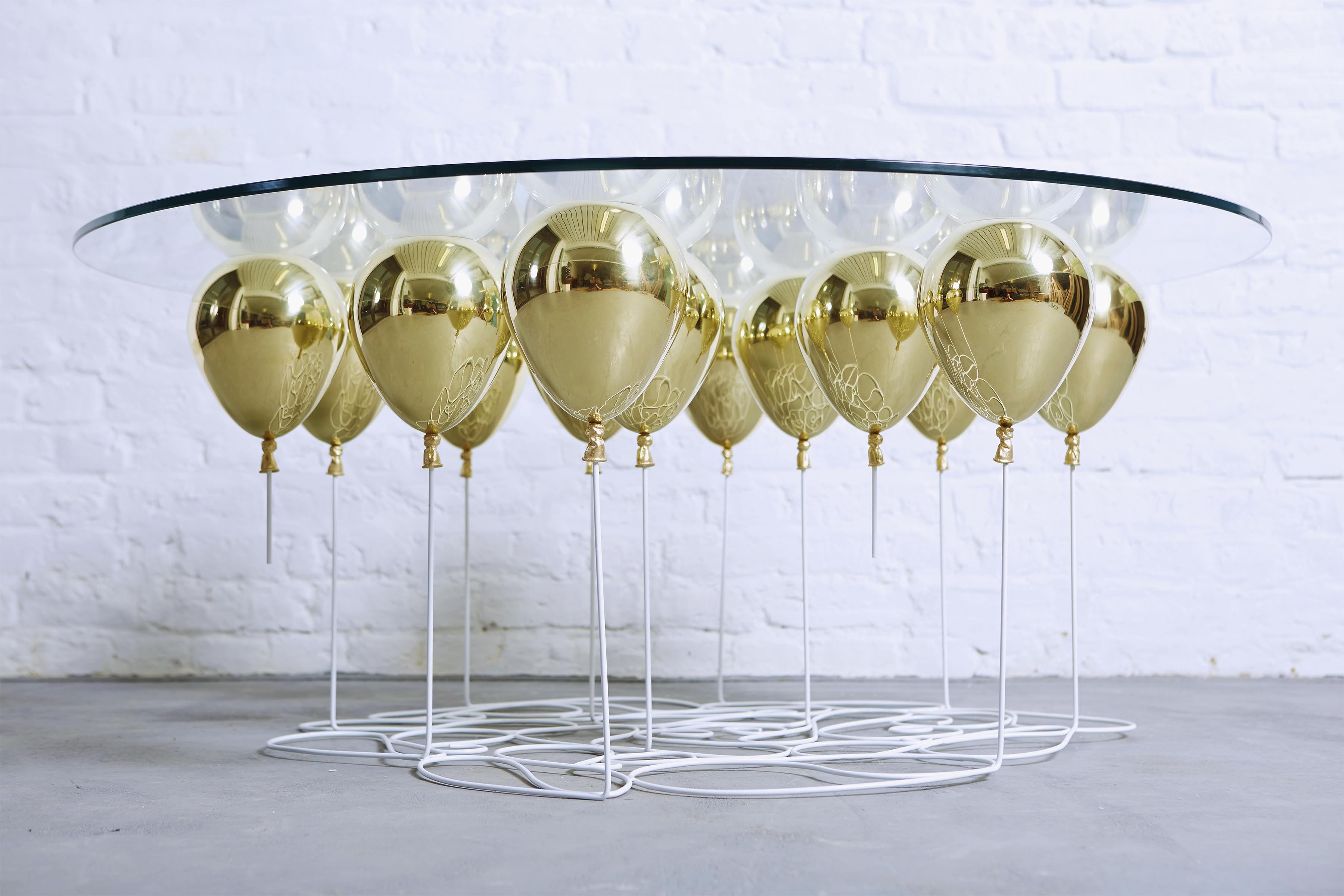 Stolić je napravljen od kaljenog stakla, metala i čeličnih šipki koje oponašaju konce na kojima baloni stoje i daju utisak beztežinskog stanja.