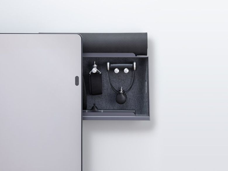 Kad se isključi, mat tamno siva boja ogledala nudi modernu neutralnu pozadinu koja će se lako uklopiti u enterijer. Forme zauzima samo četvrtinu podnožja, a sav njegov pribor i dodaci lako se pričvršćuju, odvajaju i sastavljaju. Također, mogu se pohraniti u praktični klizni prostor na stražnjoj strani uređaja i potpuno su skriveni od pogleda kada se ne koriste.