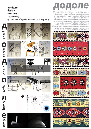 Sva data rešenja su objedinjena vizuelno grafičkim detaljima i pričom inspirisanom tradicionalnim staroslovensko-hrišćanskim verovanjima utkanim u šare pirotskih ćilima, pričama i obrednim koledarsko dodolskim pesmama. Zasnivajući koncept na tradiciji, ideja je bila da se stvore originalna rešenja koja u svemu odgovaraju savremenom životu, i koja svojom formom i funkcijom pariraju svetskim tendencijama industrijskog dizajna. Materijali korišćeni za izradu pojedinačnih komada su filc, coja drvo, aluminijum sa primenom nekih tradicionalnih konstruktivnih elemenata i detalja u izradi. Ovi materijali su sami po sebi ekološki, a tehnike izrade ne zahtevaju upotrebu agresivnih tehnika.