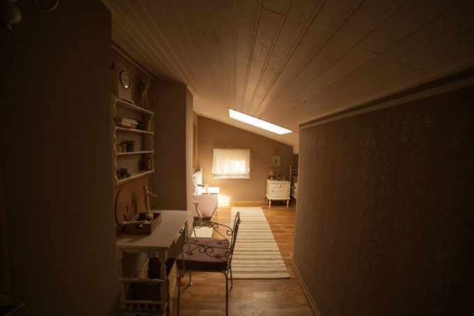 Detalji kao što su ram za ogledalo, budilnik, lampa sa abažurom i pletene korpe upotpunjuju izgled prostora. Ovo potkrovlje, uređeno u Shabby Chic stilu, idealna je kombinacija radnog i rekreativnog prostora, koji inspiriše.