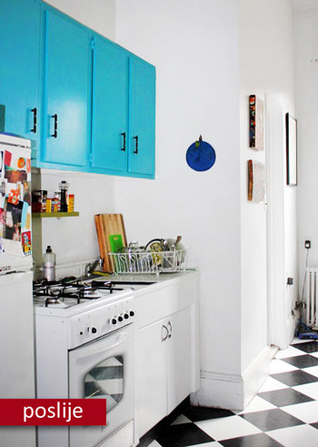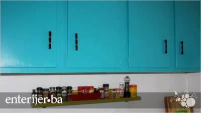Gornji kuhinjski elementi dobili su potpuno novi izgled nakon što su ofarbani divnom tirkizno-plavom bojom, koja se ističe u bijelom okruženju.