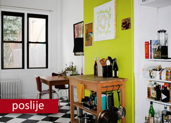 Veliku i pozitivnu promjenu u kuhinju unio je linoleum s crno-bijelim kockama koje tvore dijamantni uzorak. Ovaj uzorak vizuelno proširuje prostoriju koja je inače duga i uska.