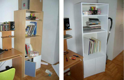 Dušica je kupila samoljepljivu mat bijelu foliju koja nije koštala mnogo, te je uz to uložila i nekoliko sati rada što je rezultiralo novom bijelom policom za knjige koja se odlično snašla u novoj opravi i već poznatoj ulozi.