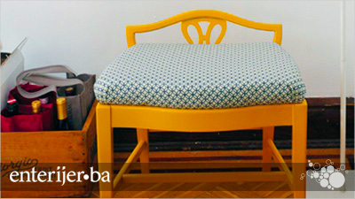 Stara klupa je išmirglana, izvađeno joj je sjedište, nakon čega je obojena u veselu, žutu nijansu. Staro sjedište je zatim tapacirano novim platnom u mornarsko plavo-bijeloj nijansi, sa jednostavnim geometrijskim šarama.