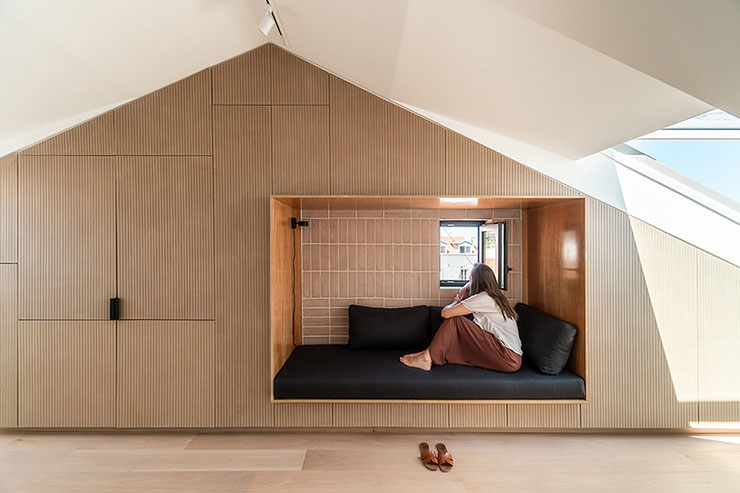 Zbog nefunkcionalnosti prijašnje konfiguracije stana i veoma lošeg stanja njegove konstrukcije došlo je do potrebne zamjene cijelog krova i preuređenja cijelog enterijera. Glavni cilj ovog projekta bio je stvoriti što otvoreniji i svjetliji prostor. Da bi postigli ovaj cilj, odlučili su da privatne prostore – spavaću sobu i kupatilo – naprave u posebnom dijelu, odvojenom od krova, ostavljajući preostali otvoreni prostor oko njega kao prostor dnevne sobe. I ostava i čajna kuhinja bili su sadržani u drugom dijelu stvorenom duž dnevne sobe, elementu integriranom u zabačenom zidu.