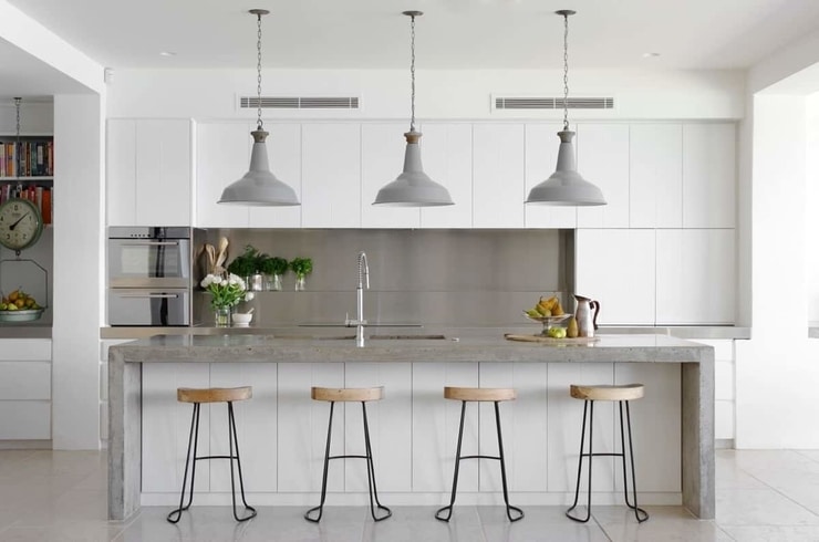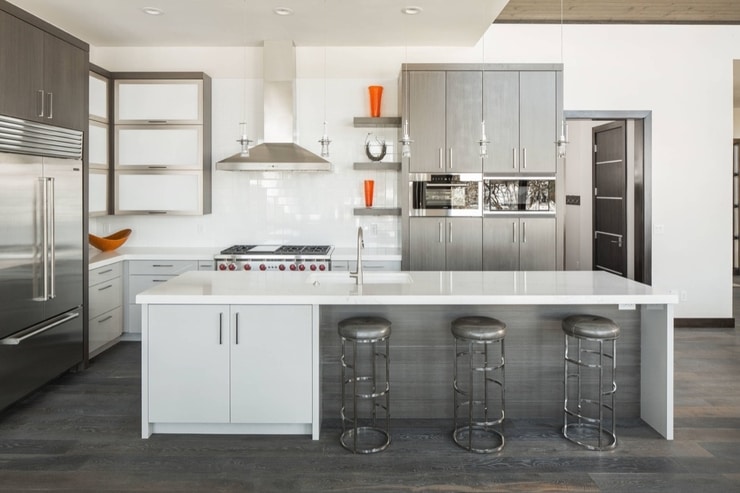 Hladne sive boje dobro izgledaju uz nehrđajući čelik, a akcenti jarkih boja, poput malih uređaja, vrata ormarića i barskih stolica, dat će prostoru vibrantnost i učiniti ga zanimljivim.