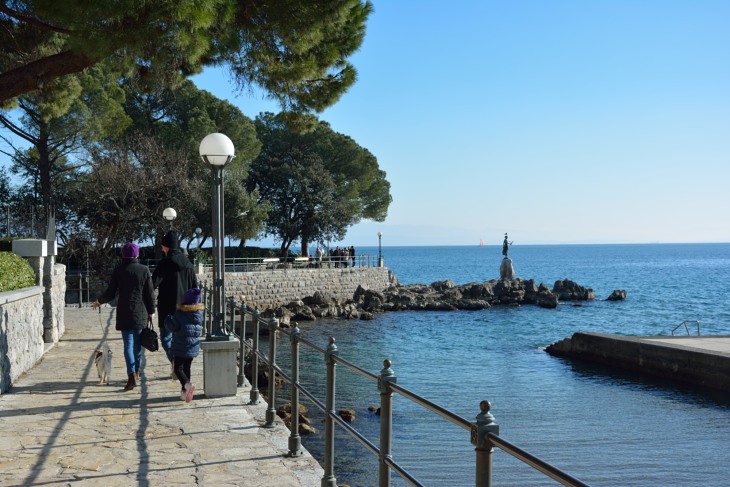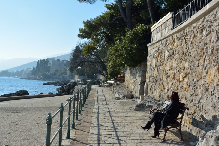 Nedjeljno jutro je osvanulo toliko toplo da smo na plaži zatekli djevojku koja se sunča. Doduše bila je ogrnuta duksericom, ali u bikiniju. Čitala je knjigu i nije marila za posjetioce koji su iz okolnih kontinentalnih krajeva došli u Opatiju za vikend da uživaju u šetnji 12 kilometara dugom rivijerom. Iako zvanično nazvano Šetalište Franca Josepha I, svi ga i dalje zovu Lungomare i jedno je od najljepših šetališta na obali Jadrana.