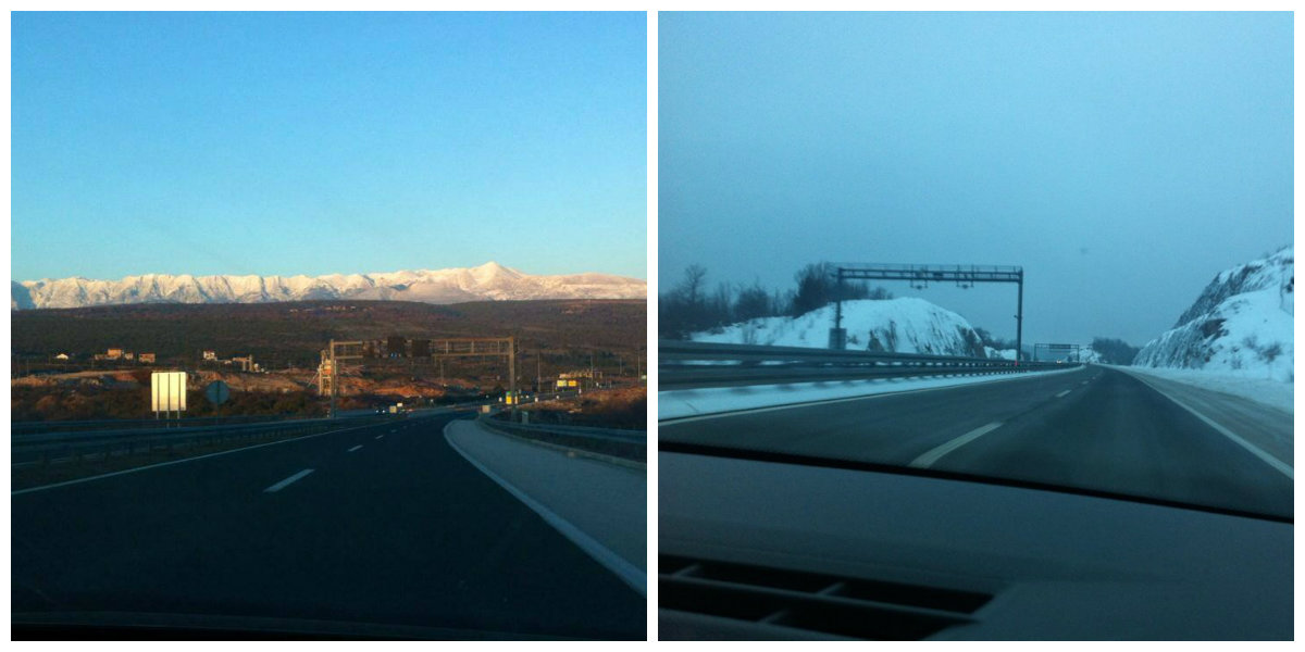 No, vratimo se na trenutak na put prema Opatiji. Budući da je bio januar i u Zadru je temperatura bila za nas iz unutrašnjosti Balkana ugodnih +10, krenuli smo put Opatije autocestom prema Rijeci. Sunce je već bilo na zalasku i pred nama se ukazao veličanstveni Velebit čiji vrhovi su bili prekriveni snijegom. Kako smo se približavali tunelu Sveti Rok, koji prolazi kroz ovu planinu dužinom od skoro šest kilometara, temperatura je počela lagano da pada. Međutim, ono što nismo očekivali je da će nas sa druge strane dočekati potpuno drugi svijet. Sumaglica, snijeg i led. Kao da smo bili katapultirani nazad u Sarajevo. Bili smo u šoku naredna dva sata koliko smo putovali kroz Liku, gorsku regiju u Hrvatskoj, sve dok se konačno nismo počeli spuštati prema Rijeci.