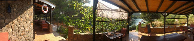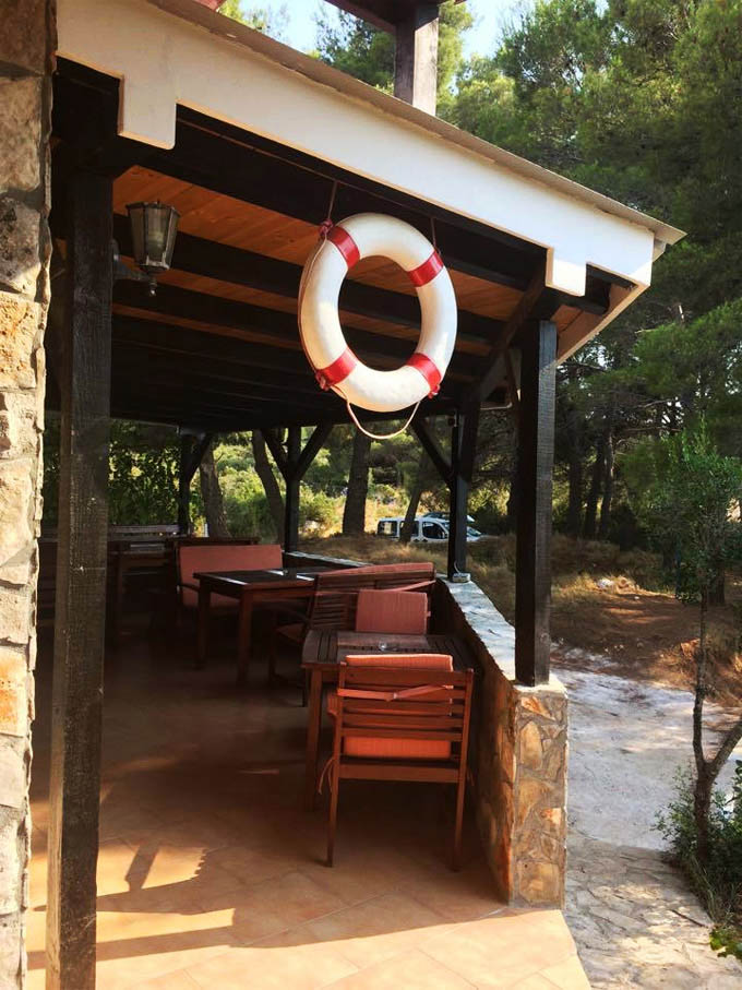 Sjeli smo na otvorenu terasu uređenu tipično dalmatinski. Drveni stolovi i stolice poredani na terakota pločicama, ribarske mreže koje vise sa stropa i obavijaju stubove, mnoštvo dekorativnih detalja izvađenih iz mora i tradicionalni pojas za spasavanje.