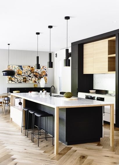 Za ljubitelje crne i one koji odluče da žele da ova boja vlada kuhinjskim prostorom, evo lijepog primjera kako kombinovati boje zida, podova i kabineta. Ideja da kuhinjski elementi budu crni, a ostatak enterijera u vedrijim nijansama, pokazuje se kao odličan dekorativni pristup.