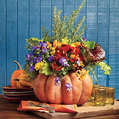 Da biste napravili ovaj aranžman, uzmite vašu omiljenu tikvu i u nju stavite nekoliko viola, maćuhica, crvenu i zelenu salatu, lišće majčine dušice i ruzmarina. Tikvu prethodno očistite, izrežite rupu na vrhu i izdubite sjemenke. Obložite je aluminijskom folijom ili plastičnom kesom, do pola napunite zemljom i u nju posadite sve ove biljke.