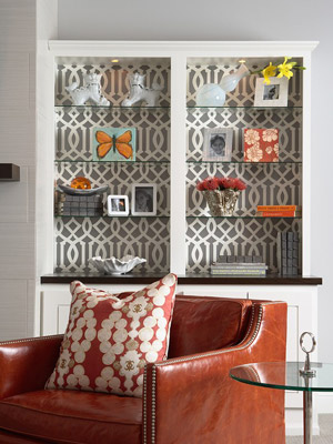 - Izrežite komade tapete i položite ih na police ispod knjiga ili njima oblijepite poleđinu police.
