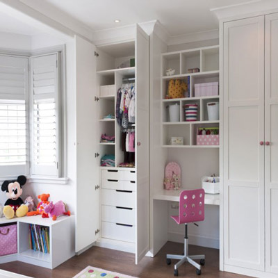Skladištenje za dječiju sobu nikad nije bilo jednostavnije. Bijeli ugradni ormar je kombinacija prostora za odlaganje stvari i radnog mjesta za učenje. Potpuno iskorišten zid za dvije funkcije koje su neophodne svakom školarcu.
