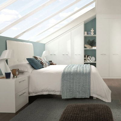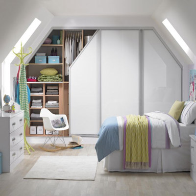 Rješenje za sobe sa oštrim kosinama. Plakar izrađen po mjeri tako da se uklopi u prostor, posjeduje izuzetno moderan stil, kojem doprinosi i polica kao sjajna ideja za razbijanje monotonije „ispunjenog“ zida.