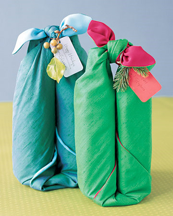 Da bi uobičajan poklon u vidu vina ili drugog pića prezentovali na drugačiji način upotrijebite zanimljivu tkaninu s uzorkom i bojama po želji. Pratite postupak motanja na priloženim fotografijama i za kraj dodajte grančicu bora za ukras i karticu sa posvetom.