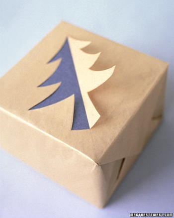 Da biste dodali malo drame u cijelu priču zamotajte poklon u dva sloja papira, prvo koristeći srebrni, a zatim zlatni papir. Na središnjem dijelu izrežite polovicu siluete bora, podižući izrezani dio i presavijajući ga, tako da se vidi komad srebrnog papira koji se nalazi ispod.
