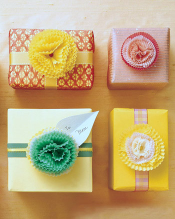 Papirne korpice za kolače mogu biti divan dodatak pri zamotavanju poklona. Koristite korpice različitih veličina. Krenite od većih ka manjim, slažući jedne u druge, a pri kraju korpice savijajte napola i tako ih slažite da bi se dobila pahuljasta cvjetna forma. Učvrstite ih rajsneglom u boji zabodenom u sredinu “cvijeta” i sa donje strane je osigurajte debljim komadom kartona. Gotov cvijet zalijepite na poklon.