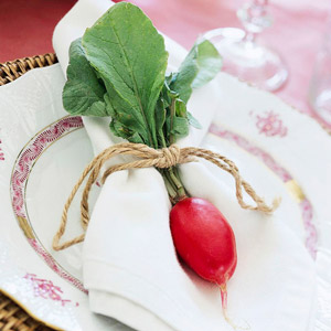 Za dekoraciju tanjira i stola iskoristite sve ono što vam je dostupno. Divna boja proljetne rotkvice može sa običnom bijelom salvetom i komadom špage izgledati posebno. Budite maštoviti. Ako imate tanjire u boji – iskoristite njih ili možda neke sa specijalnim uskršnjim motivima. Umjesto rotkvice to može da bude mrkva ili bilo šta što se nađe pri ruci.