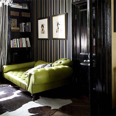 Ko bi ikada pomislio da ćilim sa crno-bijelim 'kravljim' uzorkom može biti uspješno kombinovan sa limun zelenom sofom? Ova dnevna soba to dokazuje - a čak ima i ofarbana crna vrata.