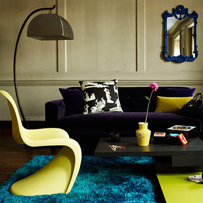 Odličan spoj materijala i tkanina. Uparite pupurnu sofu sa limun zelenim jastucima, žutom plastičnom stolicom i mat crnim stolom.