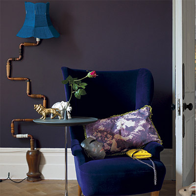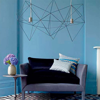 Ponekad je dnevnoj sobi potreban jedan element koji će je učiniti zanimljivom. Nešto poput ove cik-cak drvene lampe koja se odlično uklopila sa plavom foteljom i toplim zidovima boje šljive.