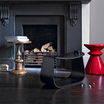 Kreirajte dramatičnu dnevnu sobu koristeći snažne boje i različite teksture. Ovdje je kamin, obojen mat bojom, u odličnom kontrastu sa ultra-modernom sjajnom crvenom stolicom.