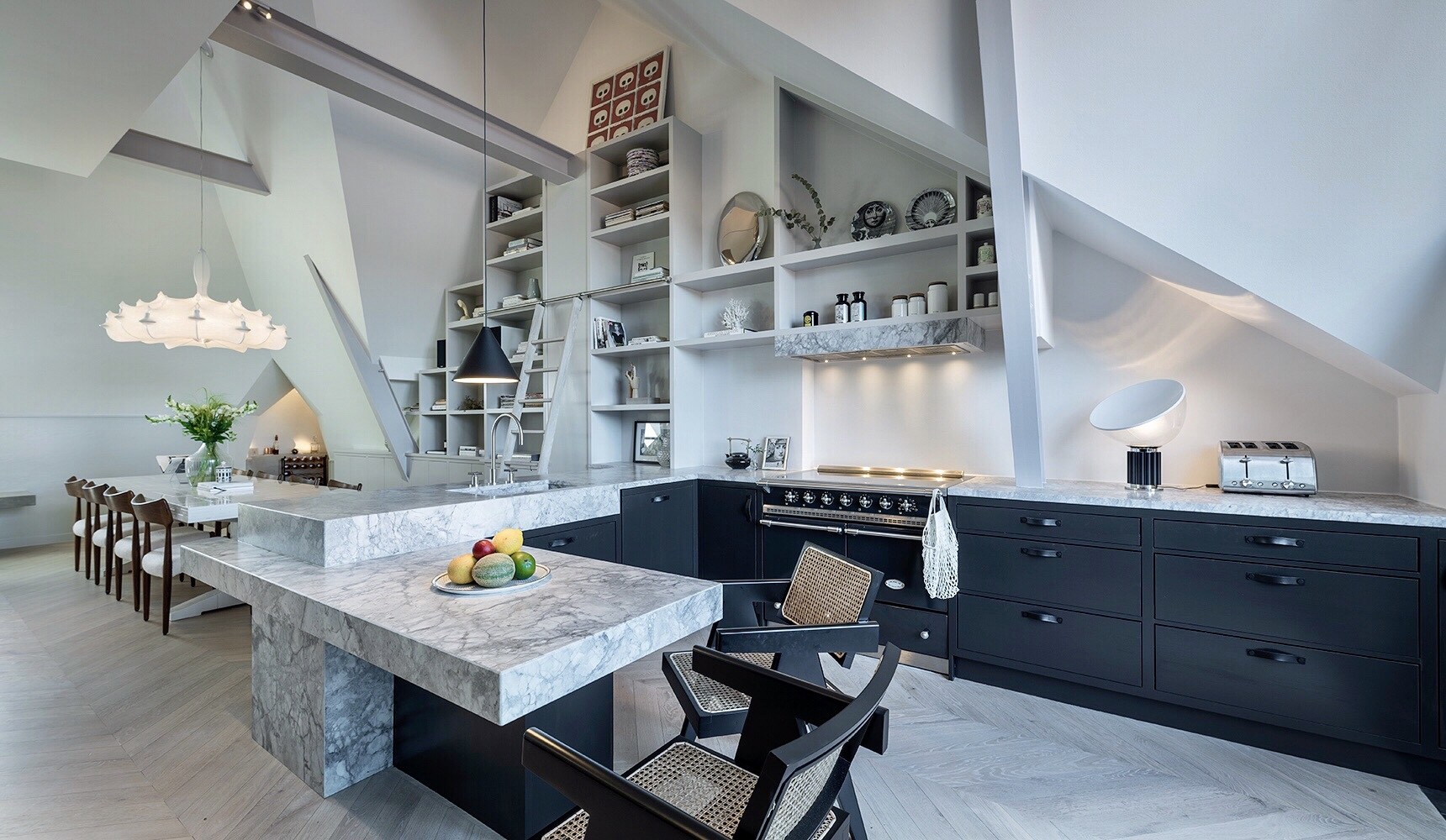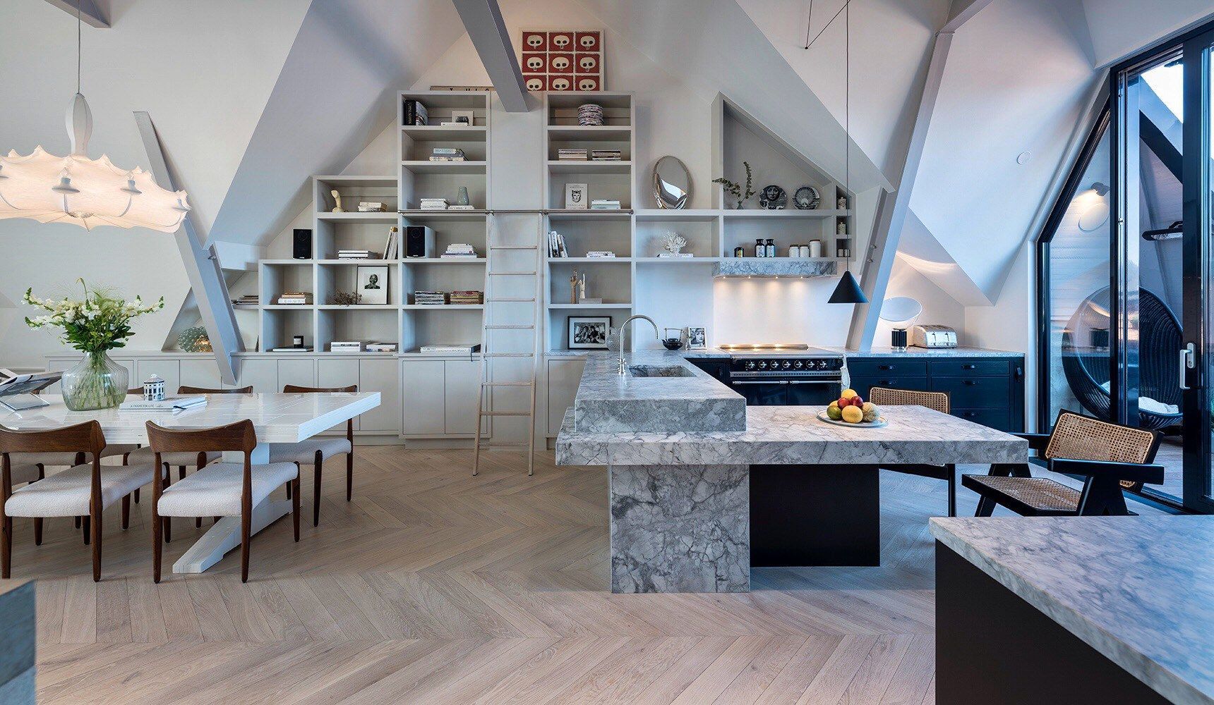 Osim impresivnog kuhinjskog ostrva od mramora, trpezarijski stol izrađen od bijelih metro pločica također je neočekivani element vrijedan pažnje.
