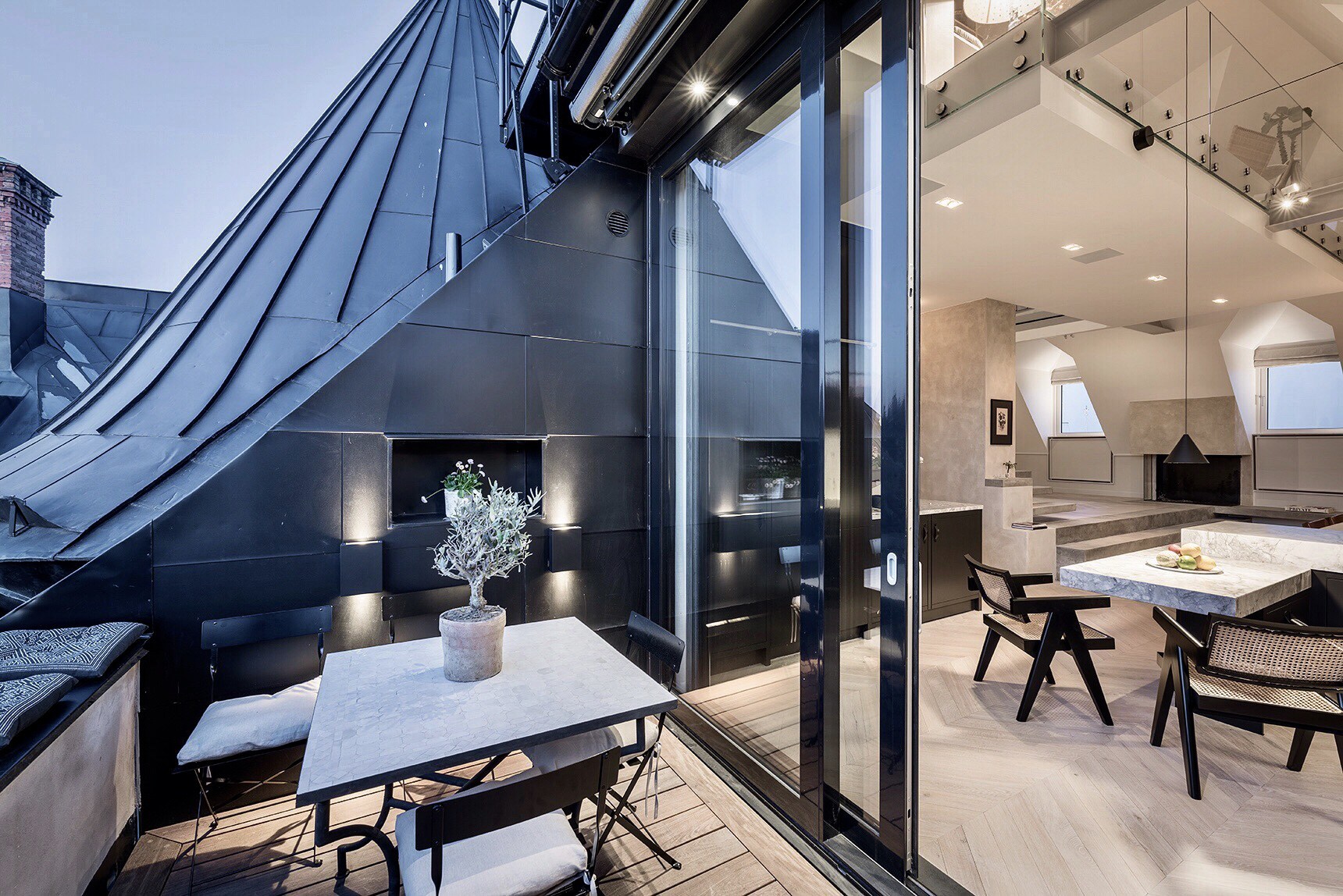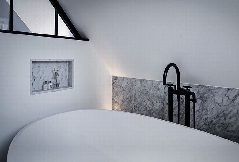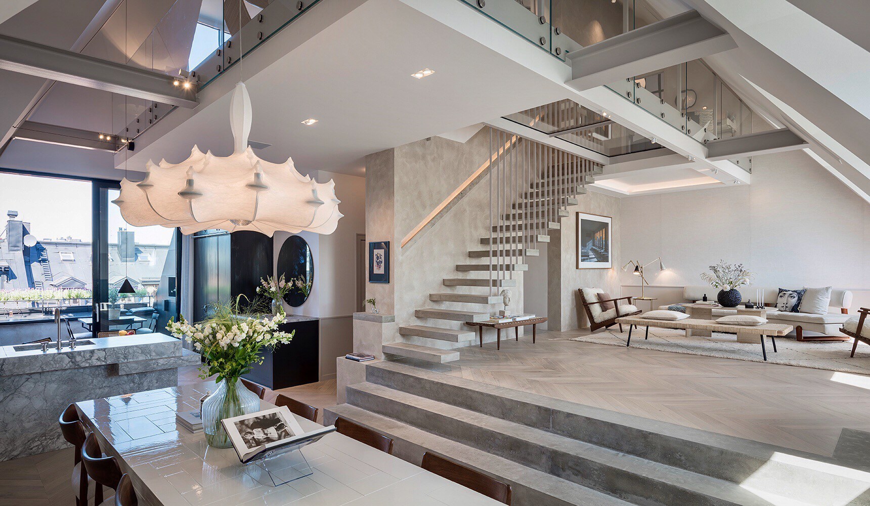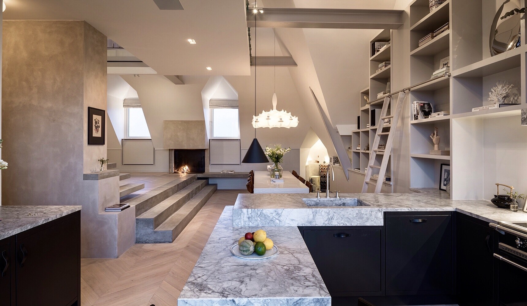 Kuhinja je crna s radnom pločom od mramora. Na podu je postavljen elegantni mat parket s uzorkom riblje kosti, a dio zida i stepenište ima uzorak betona.