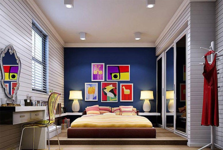 Tamno plavi zid možete obogatiti apstraktnim slikama u jarkim bojama, te dodati detalje u tim nijansama poput ove žute posteljine ili prozirne stolice.
