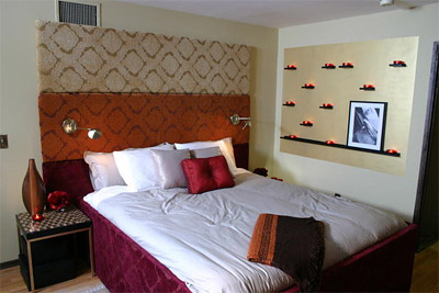 Tri nijanse istog materijala čine stepenasto, obloženo uzglavlje koje okružuje krevet, dok istovremeno daje snažan efekat boje na ovom neutralnom zidu. Dizajnerica Kim Myles je kao završni detalj u ovoj romantičnoj, omjenoj sobi dodala zid sa svijećama.