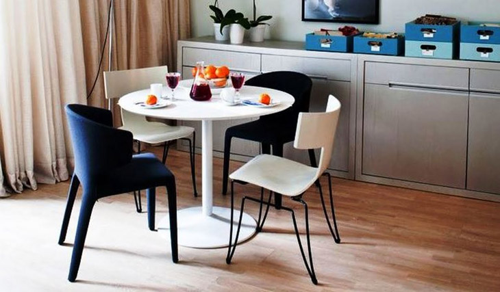 Slične ili iste stolice u različitim bojama daju trpezariji živahnu tonsku shemu. One mogu biti i monhromatske i kontrastne, a na osnovu izbora boja sobi se daje pastelan, neutralan ili dramatičan izgled. Ipak, iste stolice u različitim bojama imaju ujedinjen element – dizajn prostorije tada je više estetski „uglađen“.