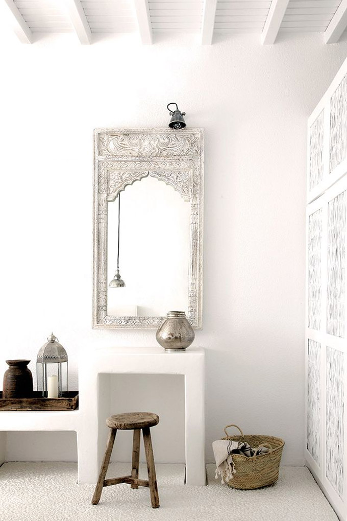 Ogledala poboljšavaju ambijent marokanskog enterijera suptilnom refleksijom svjetla, te služe i kao ukrasi na zidu. Potražite ogledala s dekorativnim okvirima od željeza, rezbarenog drveta, ili onima u obliku kupole glavice bijelog luka i sa metalnim ili ukrasima od kamenčića.