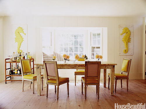 Morski konjići, antikvitet koji je nekad stajao u bašti, savršeno se uklopio u trpezariju čije uređenje potpisuje Leslie Klotz. Vizija vezana za ovu kolibu bila je 'napraviti je tako da ljeti izgleda kao prozračna koliba na plaži, a zimi topla i udobna', rekao je Klotz.