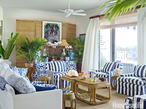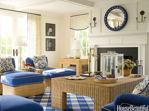 U ovoj dnevnoj sobi dizajner T. Keller Donovan otkriva svoju genijalnu sposobnost da pretumba tradicionalni stil. Namještaj od pruća ima iznenađujuće moderne obrise.