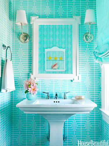 Malo kupatilo, koje je dizajnirala Mona Ross Berman, obloženo je tapetama sa jakim geometrijskim uzorkom u svijetlo-tirkiznoj boji. 'Kada uređujete ljetnu kuću imate pravo na veću zabavu, odnosno odstupanje od pravila' - kaže Berman.