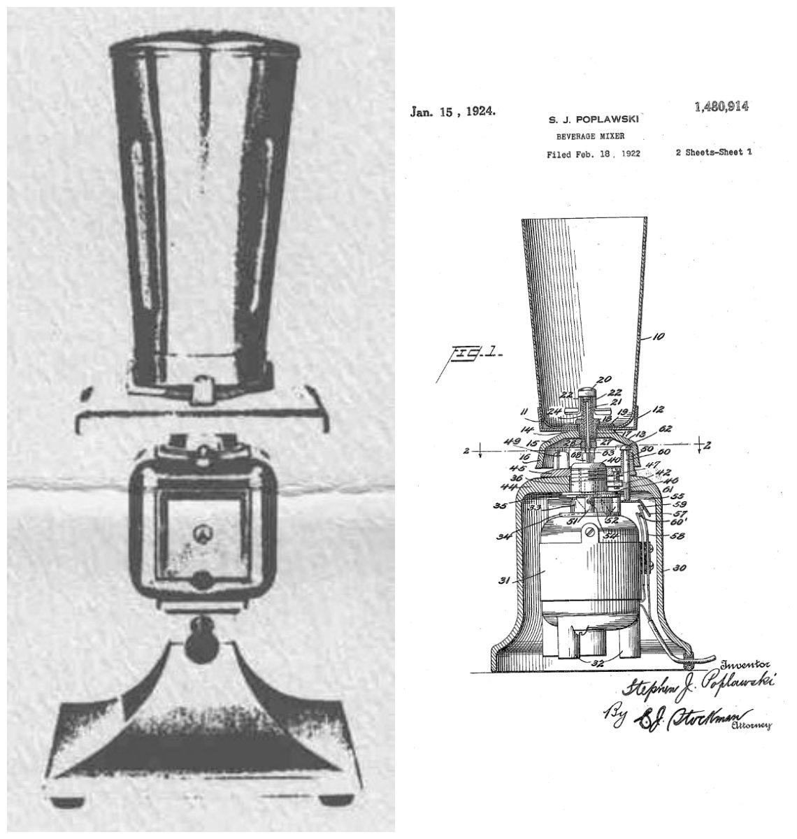 Godine 1922., Stephen Poplawski je bio prvi koji je stavio oštricu koja se okreće na dno jedne posude praveći piće soda fontana. Tako je izumio blender.