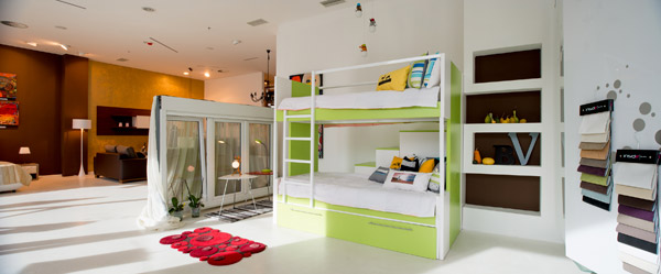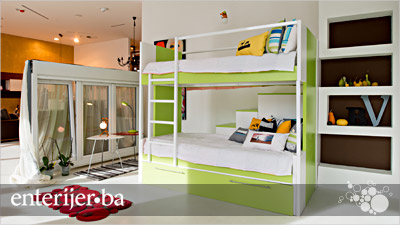 Soba za djecu i tinejdžere posjeduje i stepenišni dio, koji osim dostupnosti gornjem ležaju omogućava i dodatno skladištenje i prostor za dječije stvari. Moderno dizajnersko rješenje ovog namještaja dodatno je obogaćeno i radnim prostorom i ormarićem koji se uz krevet može poručiti. Svijetle nijanse zelene i bazna bijela čine da svjež i prozračan izgled dječija soba zadrži u svakom ambijentu.