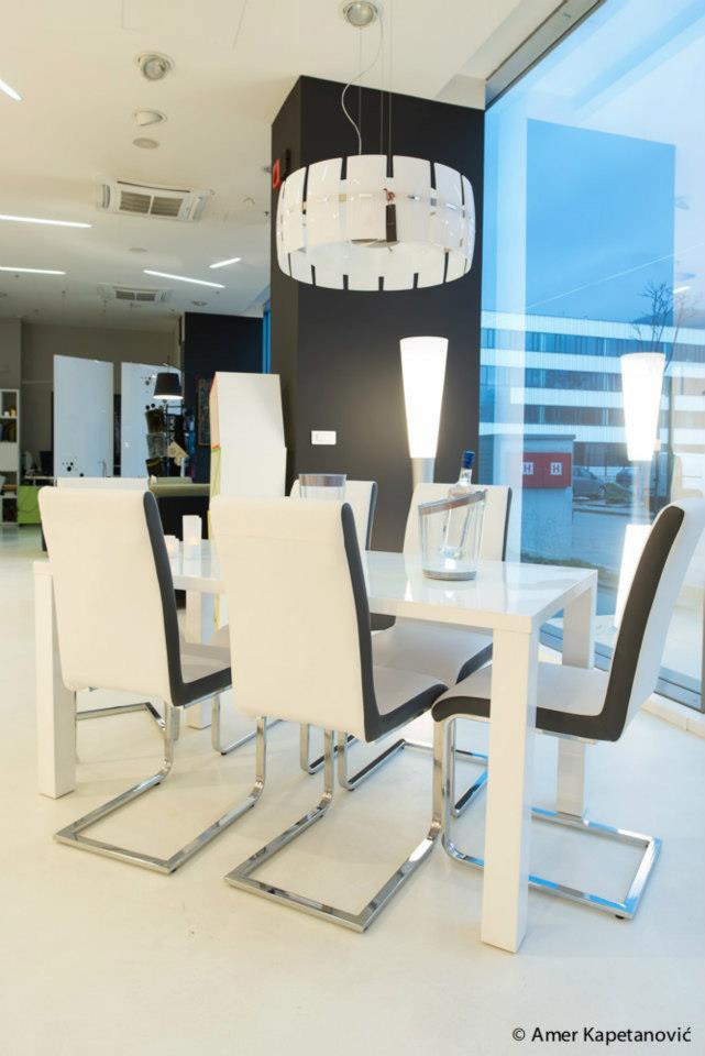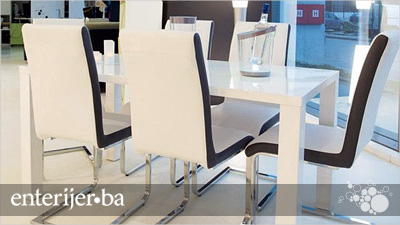 Trpezarijski stol izrađen je od medijapana visokog sjaja. Stolice posjeduju moderan izraz, te sa hromiranim "nogarama" posebno odgovaraju savremenim enterijerima.