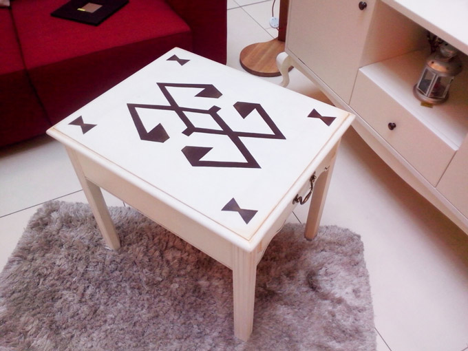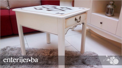 Stolić je prvobitno imao završni sloj trešnje, ali nakon obrade i pripreme uslijedio je proces farbanja. To je proces rada koji iziskuje mnogo pažnje i traje pet dana, nakon čega je predmet spreman za nanošenje akrilne impregnacije, kojoj je potrebno da se suši 24 h. Po završetku tog primarnog procesa, nanesena su dva sloja bijele akrilne boje. Tek nakon toga, stolić je spreman za ručno oslikavanje. Ornament šare sa tradicionalnog bosanskog ćilima Maja je oslikala ručno, te patinirala stolić. Nakon što je dobio svoj konačan izgled, stolić je prelakiran sa tri sloja bezbojnog laka.