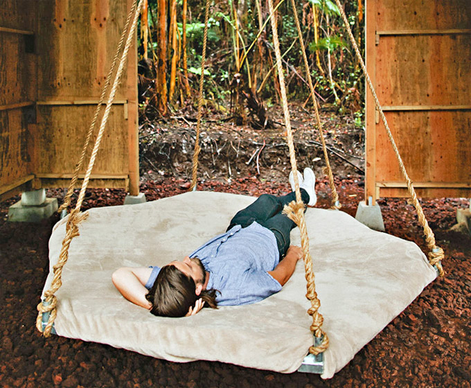 Donji dio ima krevet na ljuljanje koji je napravljen od stare trampoline. Savršen za dnevno drijemanje. Pogledajte video.
