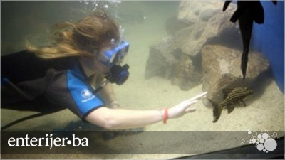 Za čišćenje akvarija potrebno je bukvalno ući unutra u ronilačkom odjelu. Na isti način se vrši i hranjenje riba, iz ruke, smrznutom ribom dva puta dnevno.