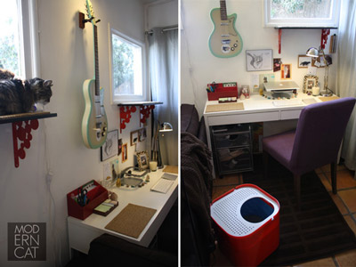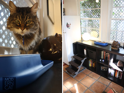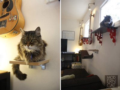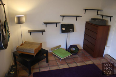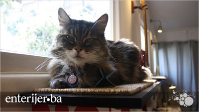 Za mali dizajnerski dodir i lakše kretanje maca postavio je i valovite police iz kolekcije namještaja namijenjenog mačkama i male police-stepenice za lakše penjanje ka prozorima.