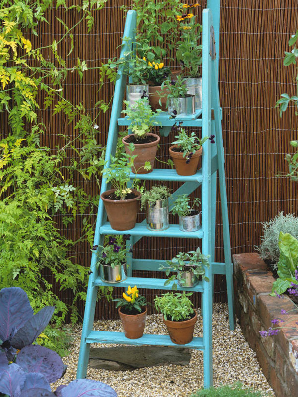 Postavljanje malih saksija na razvučenim merdevinama odličan je način da se proširi manji prostor. Na merdevine možete staviti saksije sa začinskim biljem i biljkama puzavicama.