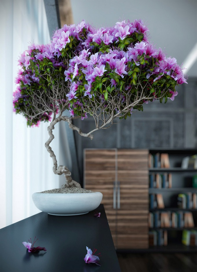Ako je vaš prostor svijetao i prozračan, izaberite neku masivnu biljku, ukrasno grmlje ili drveće. Dekorativno rješenje je nezaobilazni bonsai, koji se sadi u plitke posude sa rupom na dnu, a odgovaraju mu svi oblici od okruglog, četvrtastog do oblika pravougaonika.