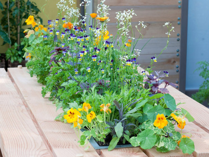 Drveni stol namijenjen za piknik ukrašen je saksijom sa jestivim biljkama koja je umetnuta u središnji dio. Neven, potočarka i viole imaju živopisne cvjetove koji su jednako ukusni kao što i izgledaju. Pobrinite se da saksije imaju rupe za odvodnjavanje.
