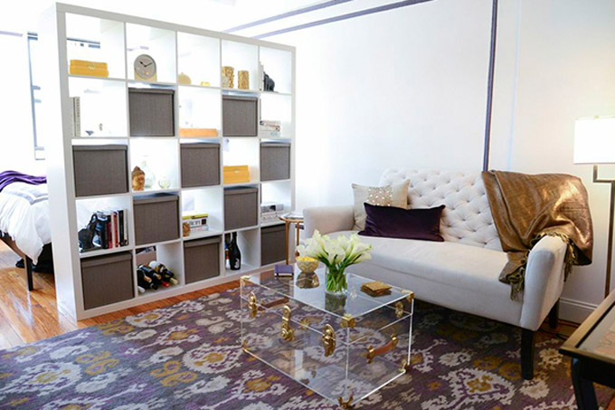 Kako bi uredila prostor, Michele je domišljato podijelila malu garsonijeru na tri odvojene cjeline - dnevni boravak, spavaću i radnu sobu. Ogromna otvorena polica za knjige je odlična za odlaganje i ograđivanje prostora spavaće sobe od dnevnog boravka bez da blokira dnevnu svjetlost.